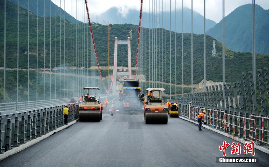 9月5日,四川康定,雅康高速泸康段大渡河“川藏第一桥”左线柏油路面铺设紧张进行,右线已完成路面铺设。当日,四川雅康高速泸定至康定段“隧道群”、大渡河兴康特大桥建设进展加快,大桥进入柏油路面铺设和护栏安装等阶段,10座隧道也进入攻坚建设关键期,雅安至康定高速公路预计2018年底将建成通车。中新社记者 刘忠俊 摄