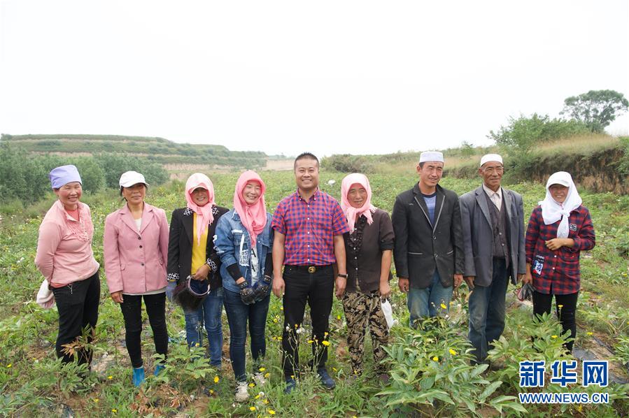 来自福建长乐的林锦云(右五)在宁夏固原市河川乡与当地农户合影(8月28日摄)。2014年,林锦云通过土地流转方式,承包了河川乡1.5万亩荒山,打造油用牡丹生产基地。目前,林锦云种下的7600亩油用牡丹已经开始受益,公司已就近吸纳村民300多人就业,其中建档立卡户39户,人均年收入2万多元。 新华社记者姜克红摄