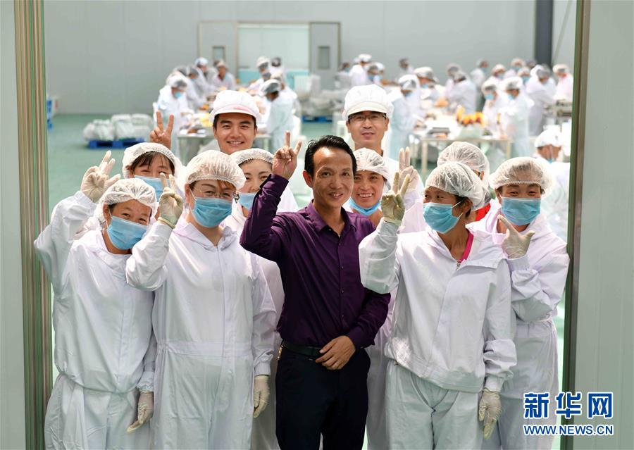 黄玉仁(前排中)在宁夏固原市隆德县宁夏黄土地农业食品有限公司与当地员工合影(8月29日摄)。来自福建莆田的黄玉仁2017年在隆德县创办宁夏黄土地农业食品有限公司,利用当地马铃薯种植优势,制作马铃薯深加工产品,促进当地马铃薯销售和农民增收。目前公司已建成4条生产线,为当地80多名百姓解决就业。 新华社记者郭绪雷摄