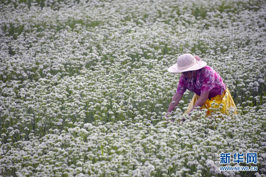 9月5日,在山东省聊城市茌平县贾寨镇韭菜地里,村民在采摘韭花。 新华社发(赵玉国 摄)