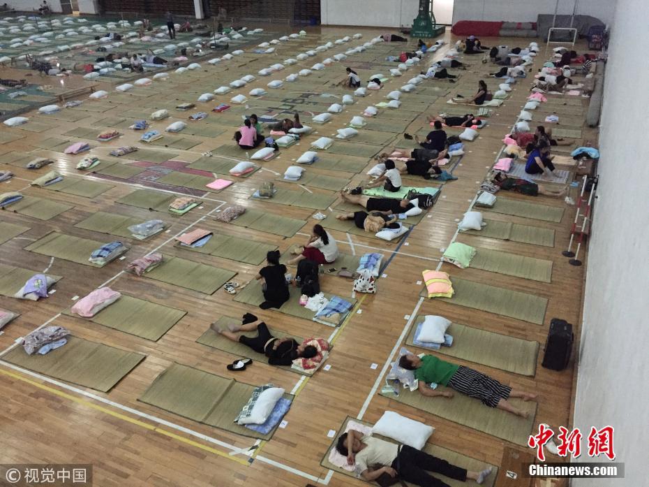 在中南民族大学体育馆门口,新生家长在登记处那里的住宿登记表填写自己的信息,之后就可以到体育馆指定好的地铺上休息,地铺陈设包括一张凉席、一个枕头和一条毛巾被。该免费临时住所的男女休息区被一张球网隔开。 图片来源:视觉中国