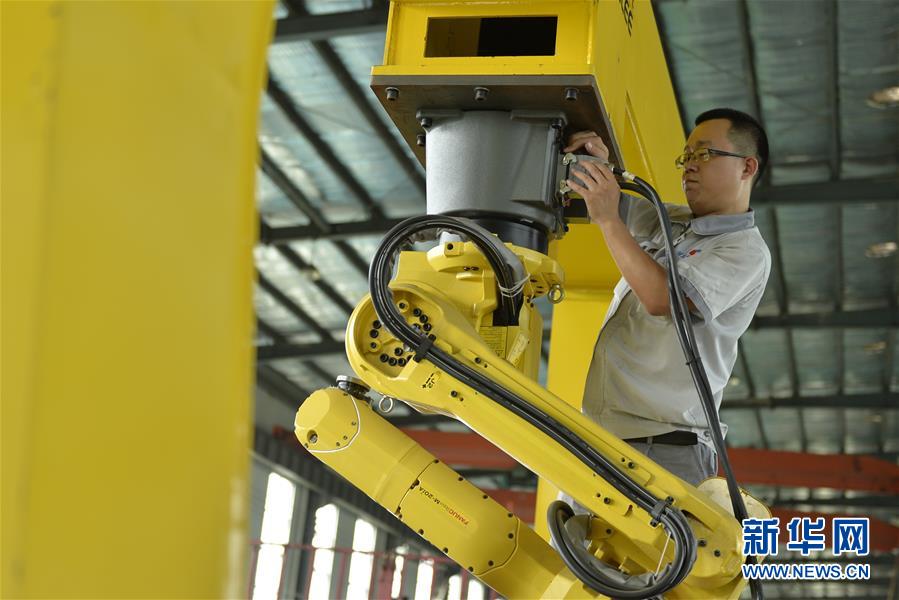 9月5日,河北创力机电科技有限公司工人安装龙门式焊接机器人。 新华社发(陈雷 摄)