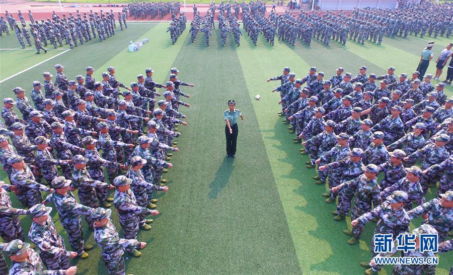 9月5日,在位于湖南省衡阳市的南华大学雨母校区,周莉慧(中)带领学生们军训。新华社发(曹正平 摄)
