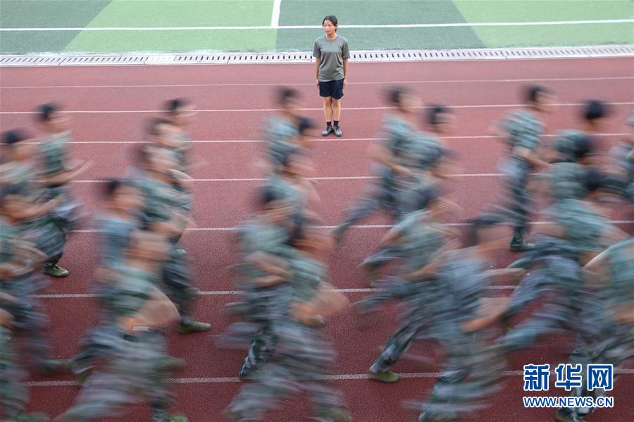 9月5日,在位于湖南省衡阳市的南华大学雨母校区,周莉慧查看学生们的跑步队形。新华社发(曹正平 摄)