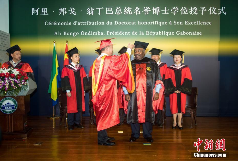 9月6日,加蓬总统邦戈被武汉大学授予法学名誉博士学位。授予仪式上,武汉大学校长窦贤康为邦戈正冠拨穗。加蓬总统邦戈在参加2018年中非合作论坛北京峰会后,于5日抵达湖北宜昌,开始对湖北进行友好访问。访鄂期间,邦戈一行参观了三峡大坝、武汉大学等地。中新社记者 张畅 摄