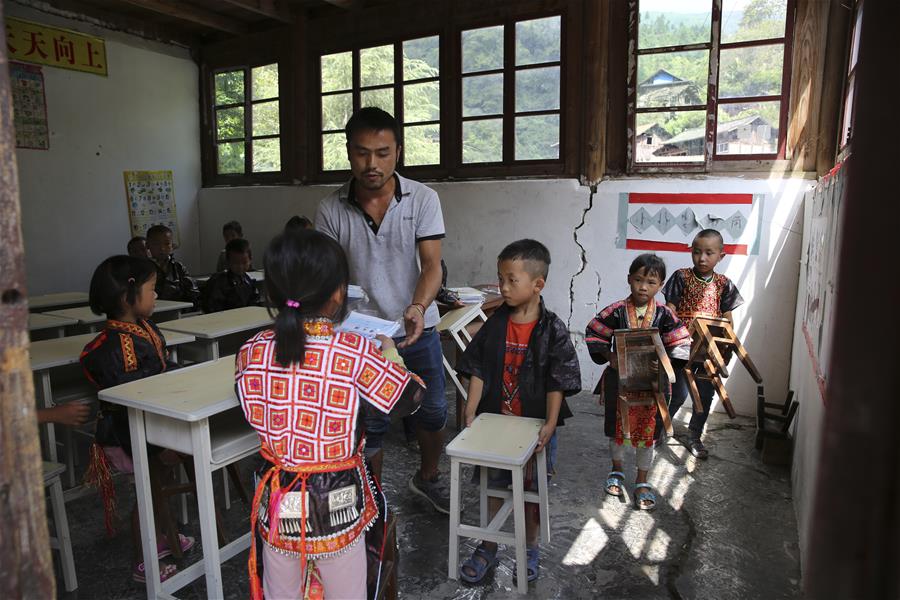 9月5日,久甲小学的师生在旧教室内搬运桌凳和书本到新教室。 在新学期开始之际,贵州省剑河县久仰镇久甲小学喜迁新校园,师生们从原来低矮破旧的木教学楼搬到宽敞明亮的新教学楼内。久甲小学是一所位于大山深处的“微小学”,目前学校由1名教师和15名一年级苗族小学生组成,他们将在新的校园里开始崭新的学习和生活。 新华社发(杨家孟 摄)