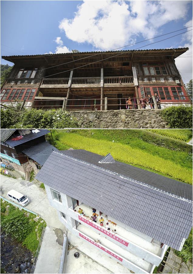 这是一张拼版图片:上图为9月5日拍摄的久甲小学老教学楼,下图为9月5日无人机拍摄的久甲小学新教学楼。 在新学期开始之际,贵州省剑河县久仰镇久甲小学喜迁新校园,师生们从原来低矮破旧的木教学楼搬到宽敞明亮的新教学楼内。久甲小学是一所位于大山深处的“微小学”,目前学校由1名教师和15名一年级苗族小学生组成,他们将在新的校园里开始崭新的学习和生活。 新华社发(杨家孟 摄)