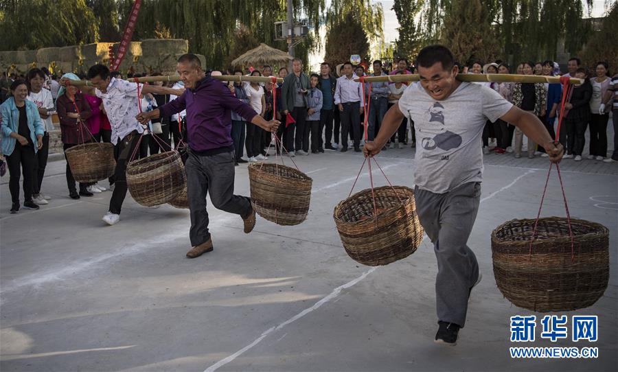 9月6日,高台县骆驼城镇群众在丰收节上进行挑担比赛。 当日,甘肃省张掖市高台县在骆驼城镇举办“丰收节”,丰富多彩的各类农事比赛、趣味文体活动,让乡亲们感受丰收的欢乐。 新华社记者 陶明 摄