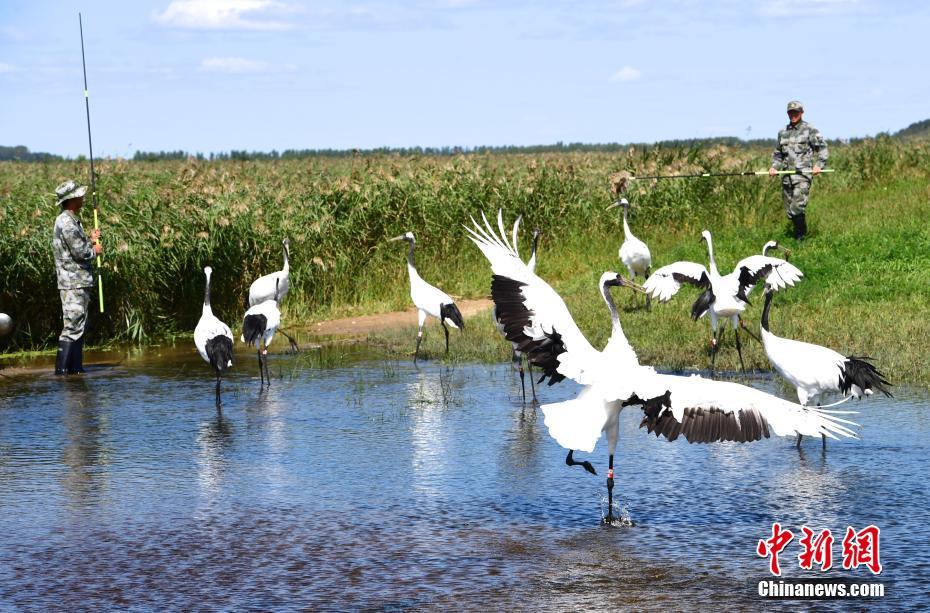 9月6日,海内外游客汇聚黑龙江扎龙国家级自然保护区观看丹顶鹤放飞美景。黑龙江省齐齐哈尔市有“鹤城”美誉,依托扎龙生态资源,着力打造“世界大湿地,中国鹤家乡”旅游品牌。目前,全世界现存野生丹顶鹤约2000只,已列入全球濒危种类,黑龙江扎龙国家级自然保护区有近300只。此外,该区人工繁育和半散养丹顶鹤种群达409只,是中国最重要的鹤类种源输出地和鹤类科研教学基地。图为扎龙自然保护区饲养员与丹顶鹤在一起。 中新社记者 陈文 摄
