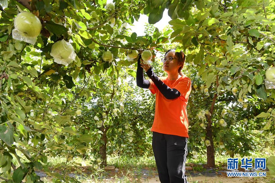 河北省曲周县相公庄科技小院学生贺敬芝在苹果种植园内观察苹果生长情况(9月6日摄)。 新华社记者牟宇摄
