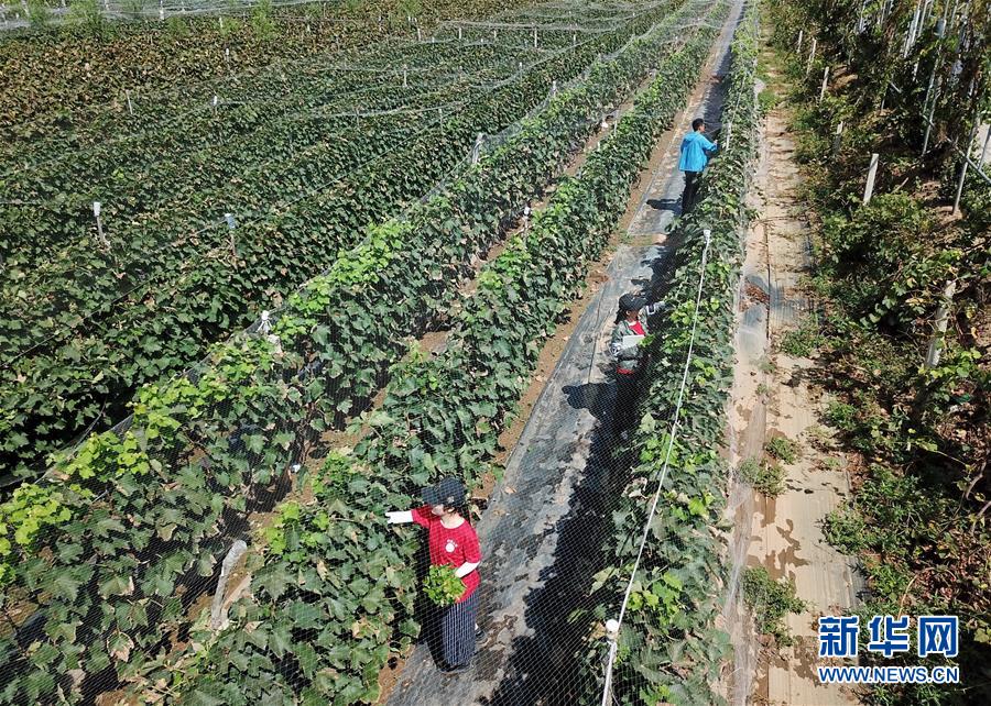 河北省曲周县前衙科技小院的学生在葡萄种植园内忙碌(9月6日摄)。 新华社记者牟宇摄