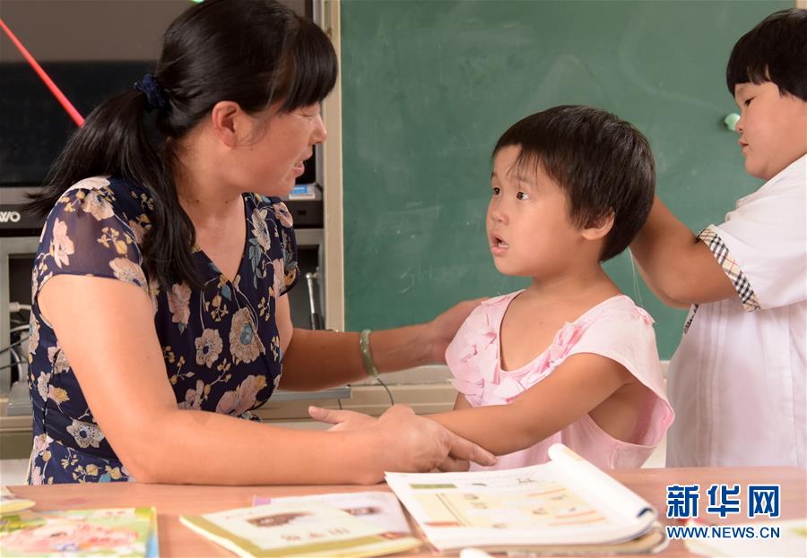 9月7日,在茶儿垅村教学点内,蒋秀兰老师(左)在和孩子谈心。新华社记者 王正忠 摄