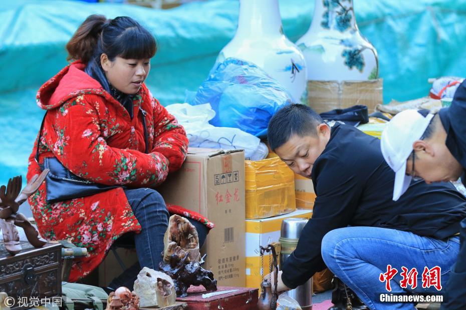 2018年9月9日,哈尔滨气温下滑,道外古玩地摊的摊主们都穿上棉服、羽绒服甚至披上棉被御寒。 图片来源:视觉中国