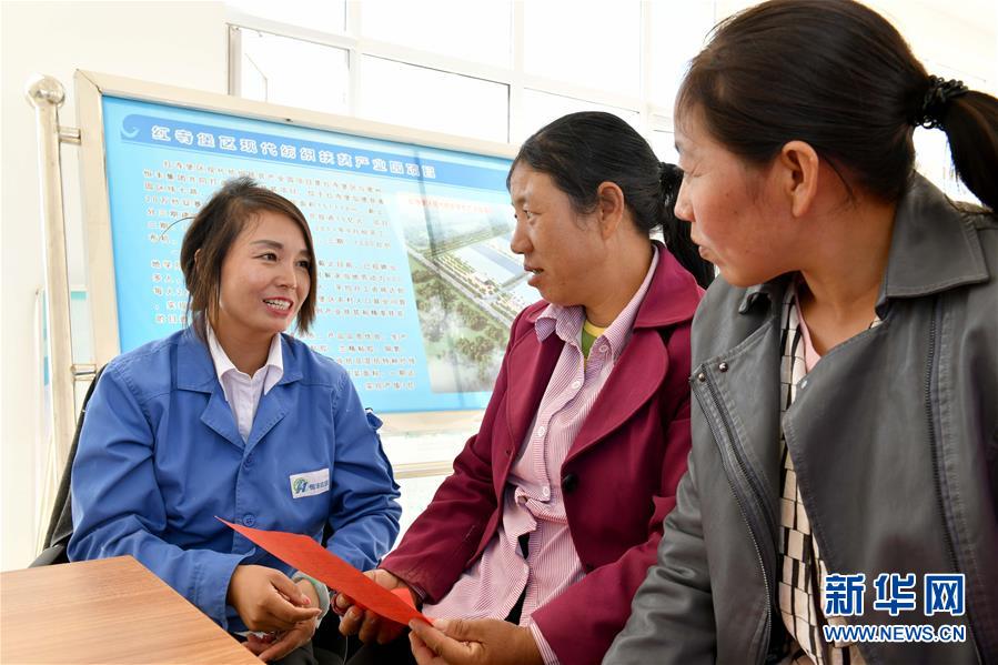 9月8日,在宁夏吴忠市红寺堡区德州恒丰集团吴忠兴民纺织科技扶贫产业园,工作人员胡英(左)向前来应聘的群众介绍薪资情况。