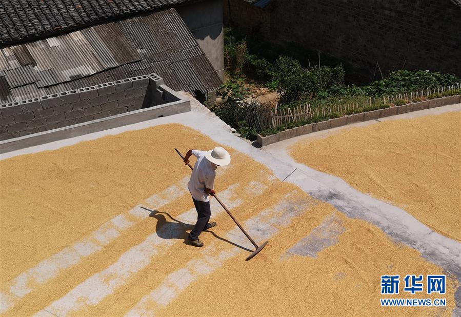9月9日,湖南张家界市永定区合作桥乡农民在晾晒稻谷。金秋时节,张家界进入中稻收获高峰期,农民在房前屋后晾晒收获的稻谷,一片丰收景象。新华社发(吴勇兵 摄)