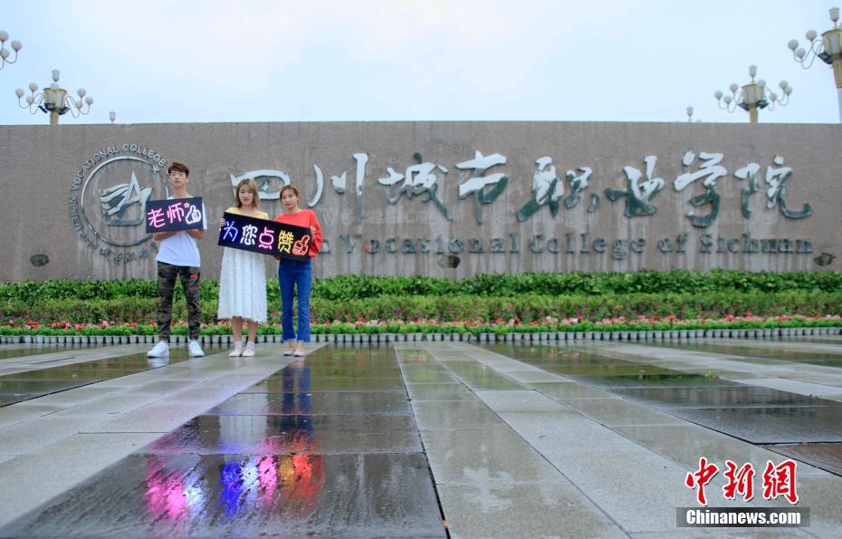 9月9日,四川眉山,校门前,3名大学生举着写有“老师 为您点赞”字样,祝福老师。第34个教师节前夕,四川城市职业学院大一新生为感谢老师们的辛勤工作,在校园里摆出“老师,您好!”、“向老师致敬!”等字样,祝福老师并为老师们“亮灯”。 中新社记者 刘忠俊 摄
