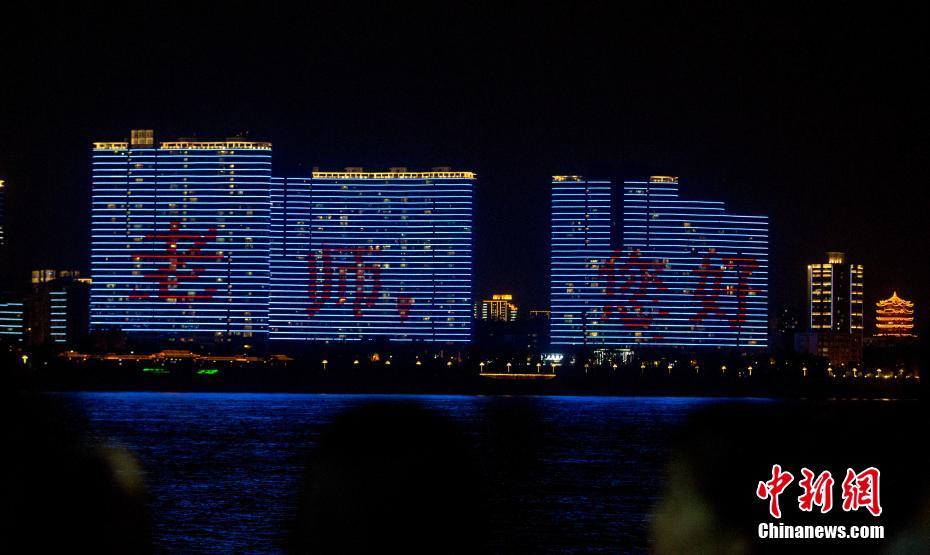 9月9日晚,湖北武汉标志性建筑和景观为教师“亮灯”,现场灯光点亮“老师,您好!”字样,向教师们送上节日祝福。据了解,此次“为教师亮灯”公益活动由教育部教师工作司、中国教师发展基金会联合发起。 中新社记者 张畅 摄