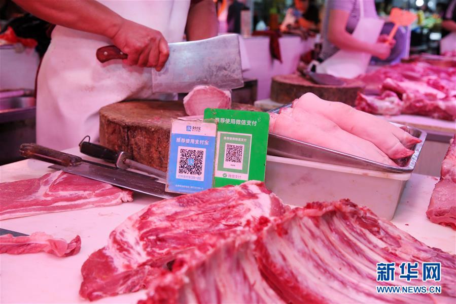 9月10日,商贩在江苏南通一家菜市场猪肉销售摊位旁切肉。