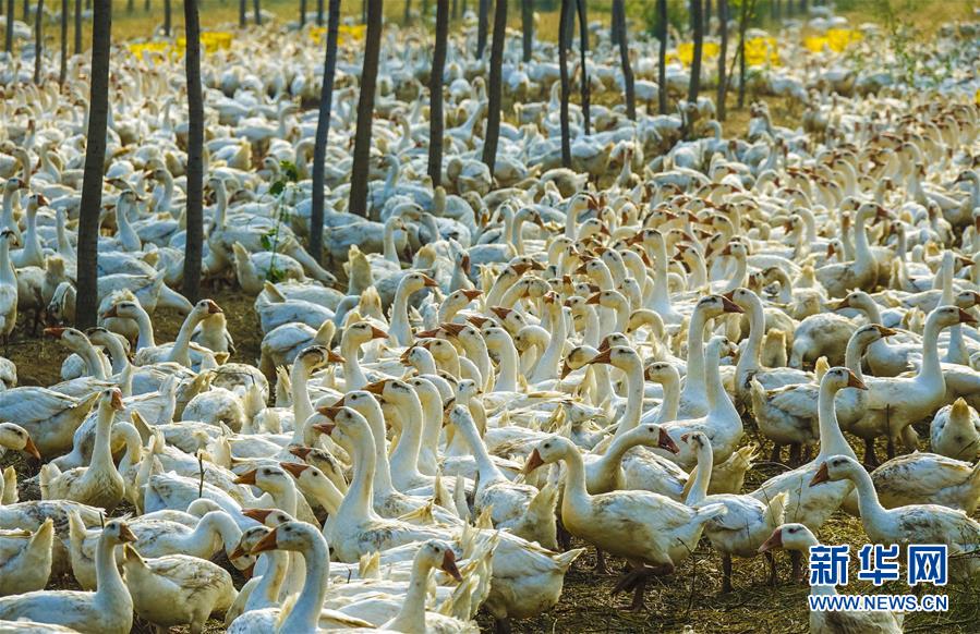 9月10日拍摄的河北大城县昌泰苗圃种植农民专业合作社林下养殖的“大三花”鹅。 近年来,河北大城县充分发挥林地资源优势,推动林下经济规模化、产业化、集约化发展,引导村民发展林下养殖产业,促进农林牧各业资源共享、优势互补,形成良性立体化生态循环体系,有效提高村民收入,加快推进乡村振兴战略步伐。据了解,该县林下经济年总产值达到2000余万元。 新华社记者 李晓果 摄