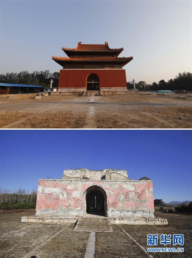 这是一张拼版照片:上图为2018年9月10日拍摄的修复中的景陵大碑楼;下图为2011年11月13日拍摄的修复前的景陵大碑楼。