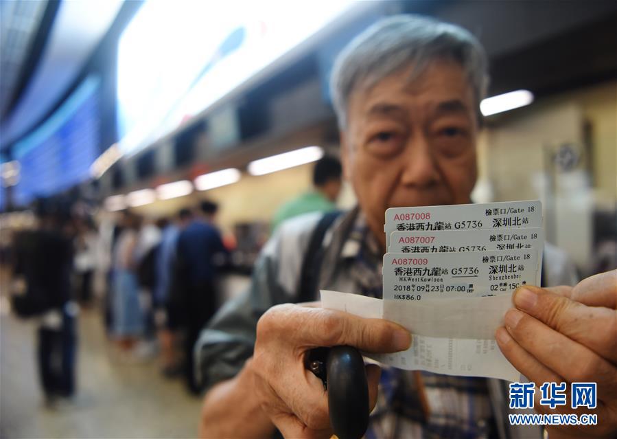 9月10日,在香港西九龙站,70岁的梁老伯展示刚刚购买的从香港西九龙到深圳北的高铁车票。
