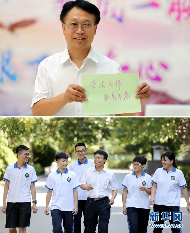 拼版照片:上图为河北省衡水中学高二语文老师王宝树展示他的教师节宣言;下图为王宝树在校园和学生们交流(9月10日摄)。 当日是我国第34个教师节,记者走进河北省衡水中学,用镜头记录下一线老师的“教师节宣言”。 新华社记者朱旭东摄