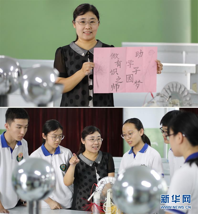 拼版照片:上图为河北省衡水中学高三物理老师郑炜展示她的教师节宣言;下图为郑炜在物理实验室为学生授课(9月10日摄)。 当日是我国第34个教师节,记者走进河北省衡水中学,用镜头记录下一线老师的“教师节宣言”。 新华社记者朱旭东摄