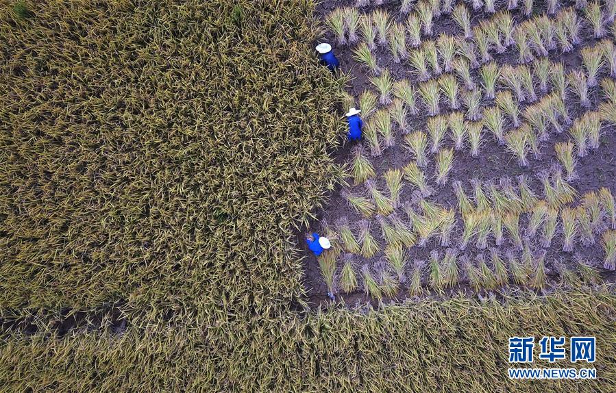 9月10日,村民在贵州省丹寨县龙泉镇羊甲村收割水稻(无人机拍摄)。 新华社发(黄晓海 摄)