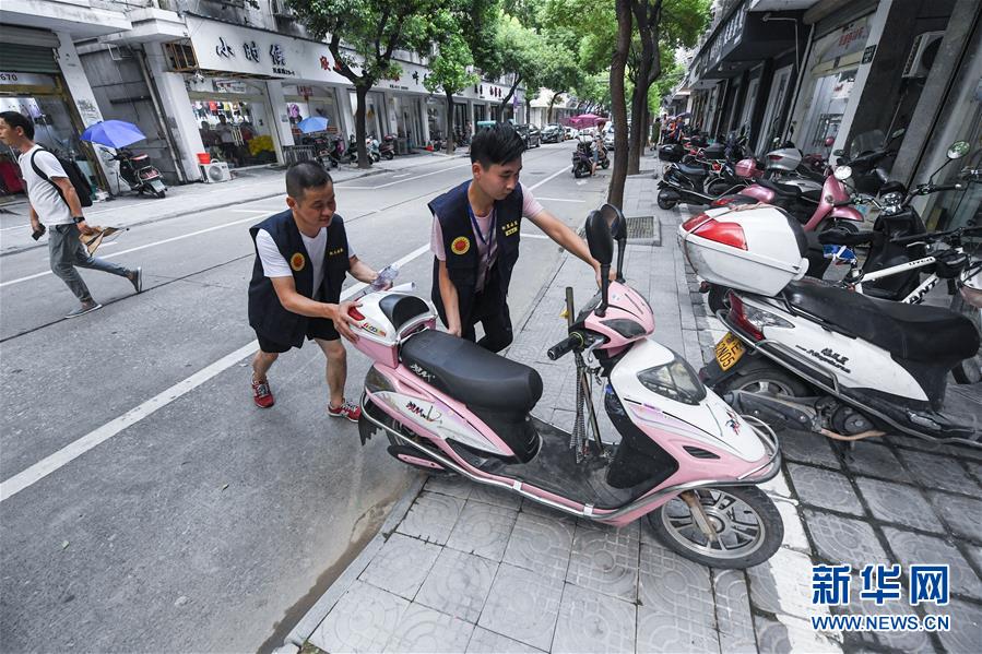 织里镇网格员将不合规停放的电动车放置到规定位置(8月7日摄)。近年来,浙江省湖州市织里镇针对童装企业多、外来人口多等特点,实行社区网格管理模式,完善网格员制度。新华社记者 徐昱 摄