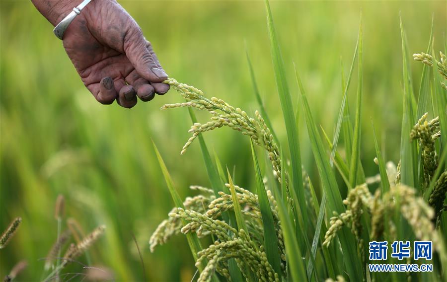 9月10日,村民在山东省临沂市郯城县郯城街道榆林六村田间查看水稻长势。 新华社发(张春雷 摄)