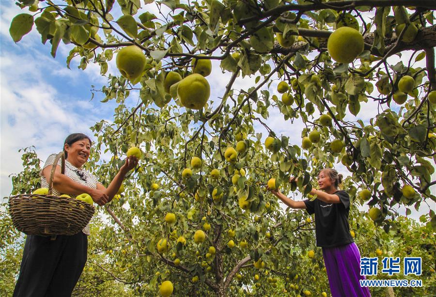 9月11日,李奉先村果农在采摘梨。 近日,河北省永清县林果专业村李奉先村果实累累,果农喜获丰收。近年来,河北省永清县坚持走生态优先,绿色发展之路,瞄准首都优质果品市场,积极引导农民优化种植结构,目前,全县优质林果种植面积达20万亩,年产葡萄、梨、桃等优质水果24万吨,产值超过6亿元,有力促进了农民增收致富,助力乡村振兴。 新华社记者 李晓果 摄