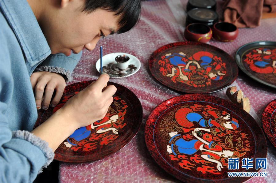 9月10日,在贵州省大方县高光彝风漆器工艺制品厂,手工艺人在彩绘漆器制品。 从生漆收割、胎坯制作、工艺装饰到漆器形成,所有环节全部由手工完成,每道工序要求很高,只能靠长期从事漆器制作的师傅凭经验来完成,这就是贵州大方漆器的独到之处。 大方漆器制品采用牛、羊等皮革和棉、麻、绸、木等做胎,同时采用当地优质的生漆作为原料,在长期的探索和实践中形成了一套以皮胎漆器为主的漆器制作工艺。如今,为更好地保护和传承大方漆器制作技艺,当地文化遗产管理部门成立了漆器髹饰技艺传习所,聘请非遗传承人免费授课,并将大方漆器引进电子商务领域,拓宽销售渠道,让这门古老的技艺得以传承。 新华社发(杨文斌 摄)