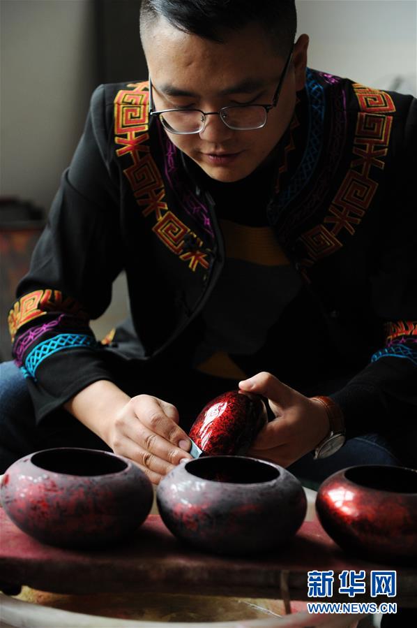 9月10日,在贵州省大方县高光彝风漆器工艺制品厂,非遗传承人高焱在打磨漆器制品。 从生漆收割、胎坯制作、工艺装饰到漆器形成,所有环节全部由手工完成,每道工序要求很高,只能靠长期从事漆器制作的师傅凭经验来完成,这就是贵州大方漆器的独到之处。 大方漆器制品采用牛、羊等皮革和棉、麻、绸、木等做胎,同时采用当地优质的生漆作为原料,在长期的探索和实践中形成了一套以皮胎漆器为主的漆器制作工艺。如今,为更好地保护和传承大方漆器制作技艺,当地文化遗产管理部门成立了漆器髹饰技艺传习所,聘请非遗传承人免费授课,并将大方漆器引进电子商务领域,拓宽销售渠道,让这门古老的技艺得以传承。 新华社发(杨文斌 摄)