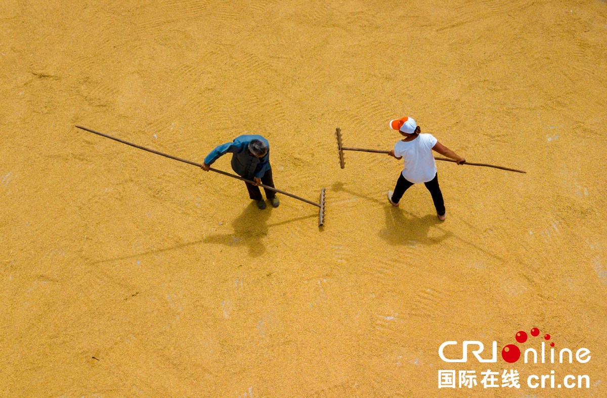 9月11日,河北省任县西固城乡小东吴村农民在将收卷的草坪装车(无人机拍摄)。