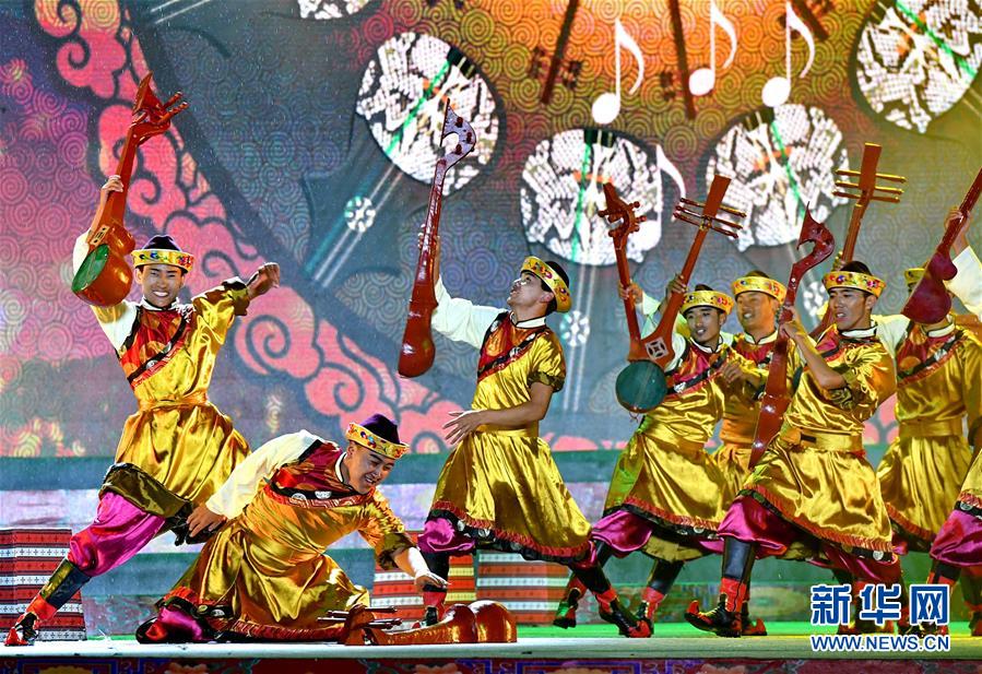 这是林芝市民族艺术团的演员在表演歌舞节目(9月10日摄)。