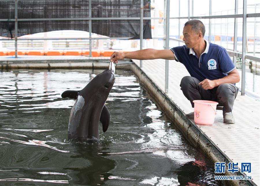 9月11日,在湖北长江天鹅洲白鱀豚国家级自然保护区,一名工作人员正在给网箱饲养的江豚喂食。 新华社记者 金立旺 摄