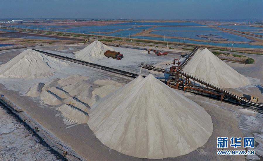 9月10日,长芦盐区大清河盐场的机械设备在进行秋盐收获作业(无人机拍摄)。 新华社记者 杨世尧 摄