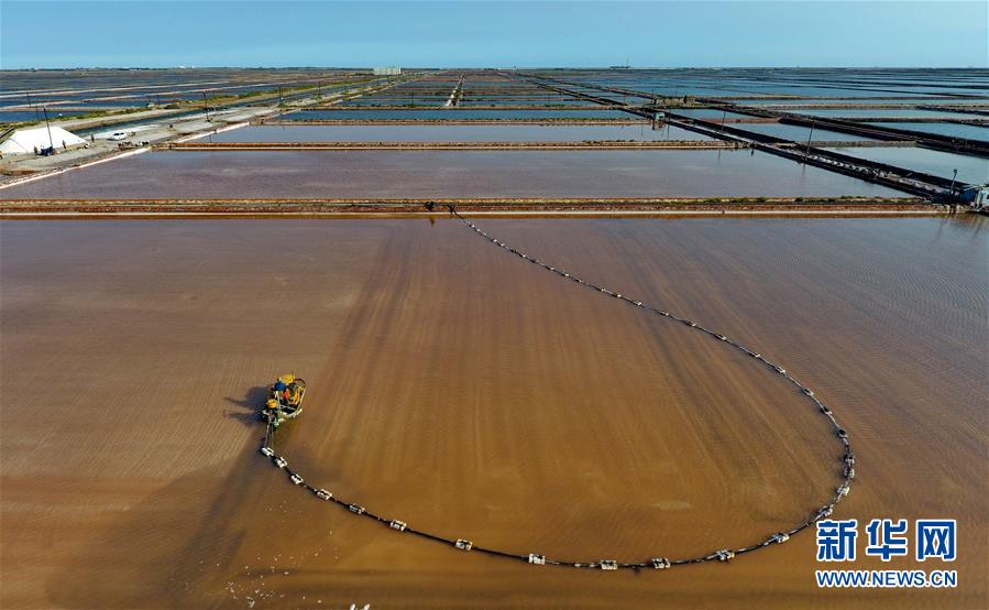 9月10日,长芦盐区大清河盐场的工人在操作机械设备收获秋盐(无人机拍摄)。 新华社记者 杨世尧 摄
