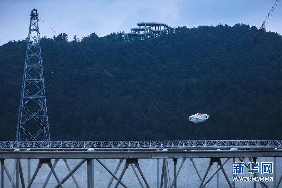 9月11日,“中国天眼”馈源舱升起在空中。新华社记者 欧东衢 摄 图片来源:新华网