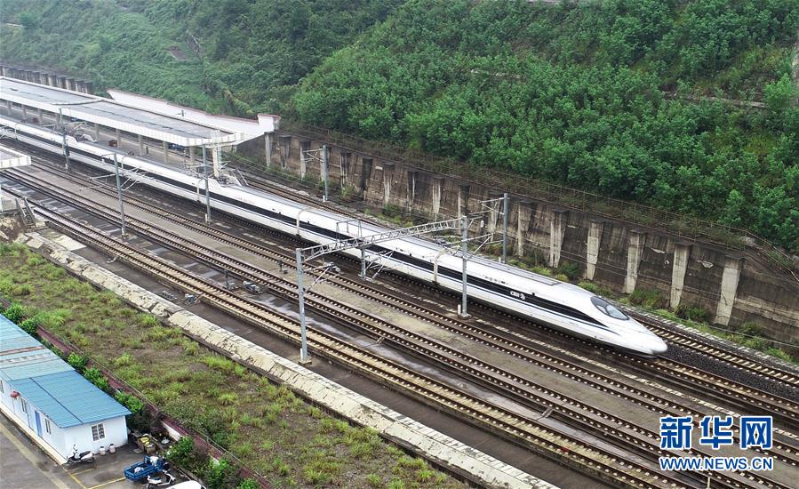 9月12日,一列动车组列车从铜仁南站驶出(无人机拍摄)。新华社发(吴吉斌 摄)