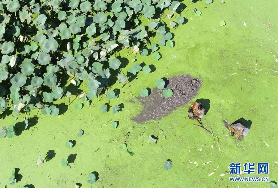 9月12日,在江苏省海安市墩头镇新舍村,藕农在采收浅水藕(无人机拍摄)。