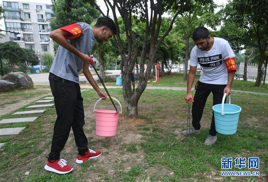 9月12日,外籍志愿者在玉堂桥社区的公园内参加卫生清洁工作。 新华社记者 徐昱 摄