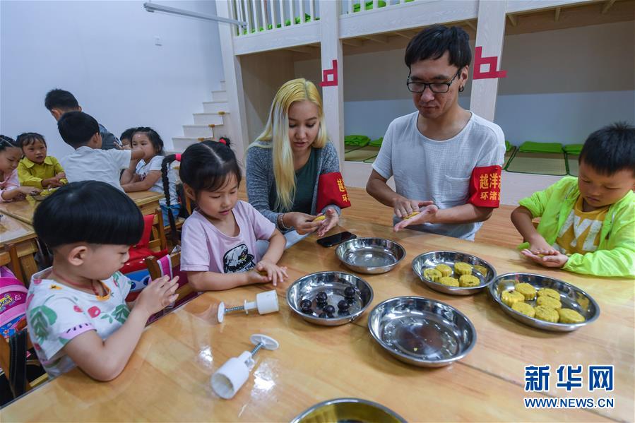 9月12日,在环渚中心幼儿园,来自哈萨克斯坦的外籍志愿者占撒亚(右三)等与孩子们一起做月饼。 新华社记者 徐昱 摄