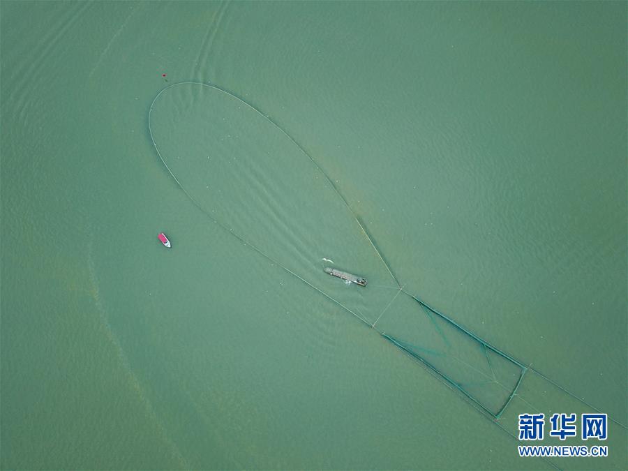 9月12日,浙江湖州吴兴区幻溇村渔民在太湖上收渔网(无人机拍摄)。新华社记者 翁忻旸 摄