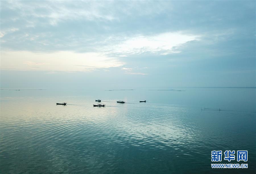 9月12日,浙江湖州吴兴区幻溇村渔民驾驶渔船在太湖上捕鱼(无人机拍摄)。新华社记者 翁忻旸 摄