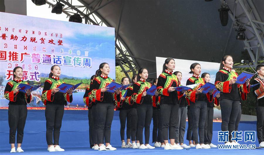 9月12日,在第21届全国推广普通话宣传周开幕式上,当地学生朗诵《玛牧特依》。 当日,以“说好普通话,迈进新时代”为主题的第21届全国推广普通话宣传周开幕式在四川省西昌市举行。 新华社发(黄国兵 摄)