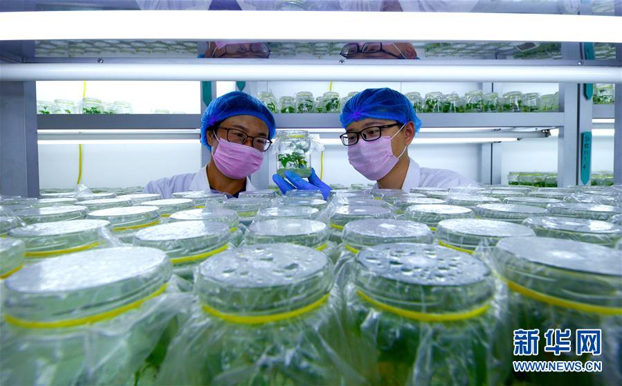 9月12日,在邯郸市磁县禾下土脱毒红薯种苗扶贫基地,科技人员在培养室里观察红薯种苗生长情况。