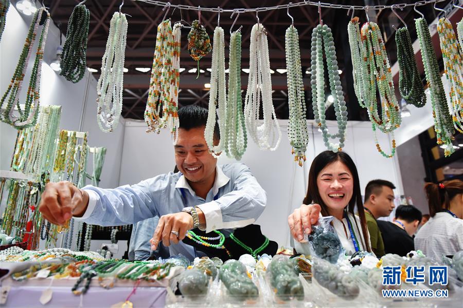 9月12日,在广西南宁国际会展中心东盟博览会展厅,两名缅甸参展商在展示饰品。 当日,第十五届中国—东盟博览会在广西南宁国际会展中心举行。 新华社记者 李芒茫 摄