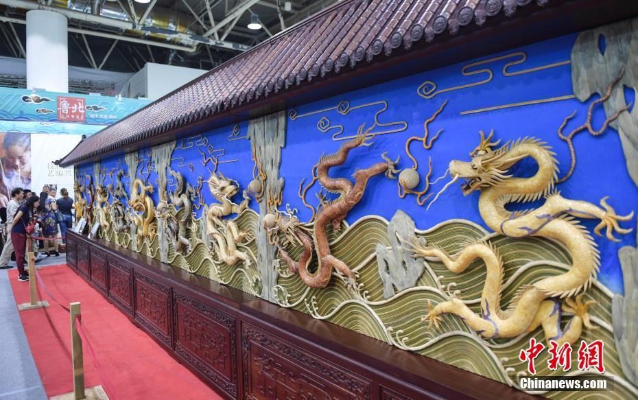 9月13日,观众欣赏草编“九龙壁”。当日,第五届中国非物质文化遗产博览会在山东济南开幕,来自全国的优秀非物质文化遗产项目及传承人现场展示非遗精华,让观众近距离观赏“活态非遗”的魅力。中新社记者 张勇 摄