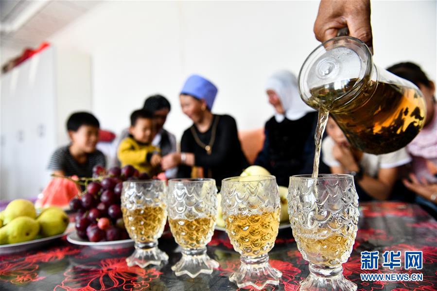 在中宁县喊叫水乡贺家口子村贺金文家,贺金文在为家人倒茶(9月6日摄)。新华社记者 郭绪雷 摄